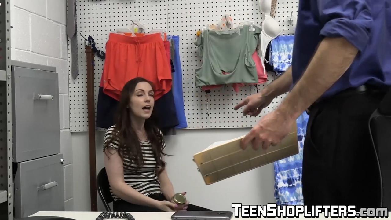 Raven, a gorgeous brunette teen in a uniform, gets caught shoplifting by Wrex Oliver. In a twist of fate, he decides to teach her a lesson by fucking her hard in missionary position. Her moans fill the office as she takes his big cock deepthroat style. He blows his load on her face in front of the body camera.