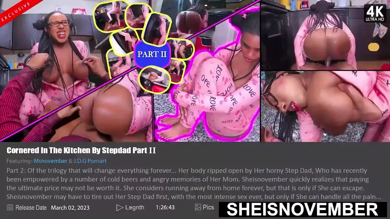 Cute black Sheisnovember with gorgeous large areola and tit show takes a rough fucking in reverse cowgirl while her spouse is away. She moans loudly as her huge tits bounce with each hard thrust from her horny hunk. He cums inside her, leaving her a creampie to clean up.